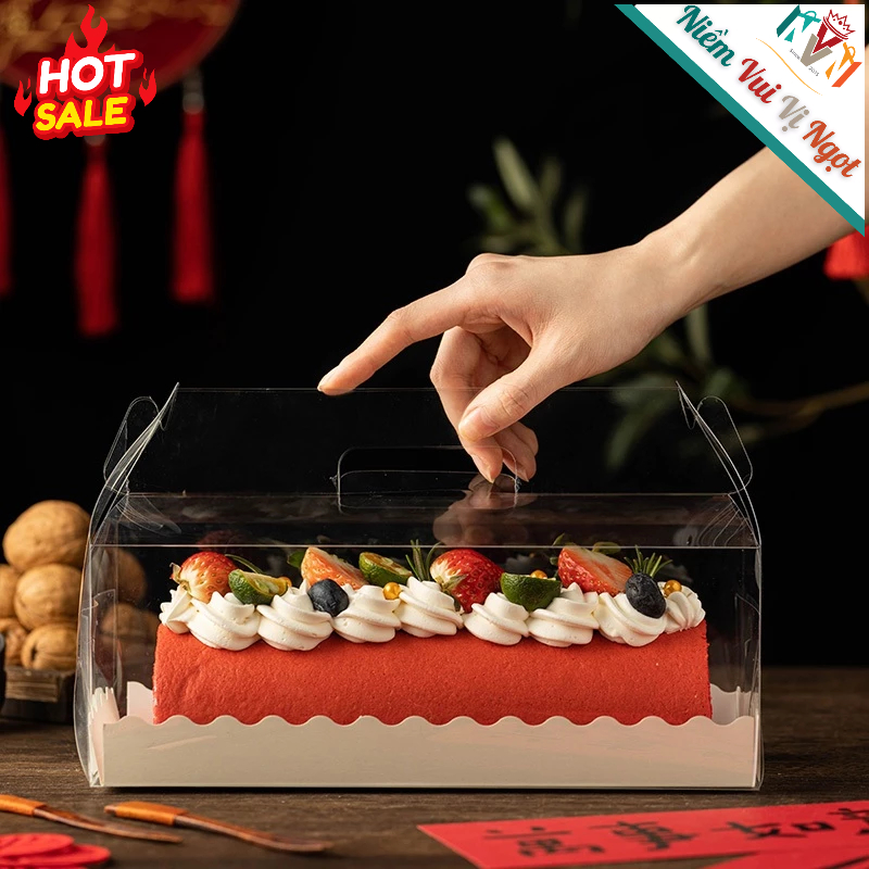 10 Hộp Nhựa Trong Quai Xách Đựng Bánh Bông Lan Cuộn, Bánh Kem Cây Thông, Rau Câu Hoa (27 x 9 x 8cm)